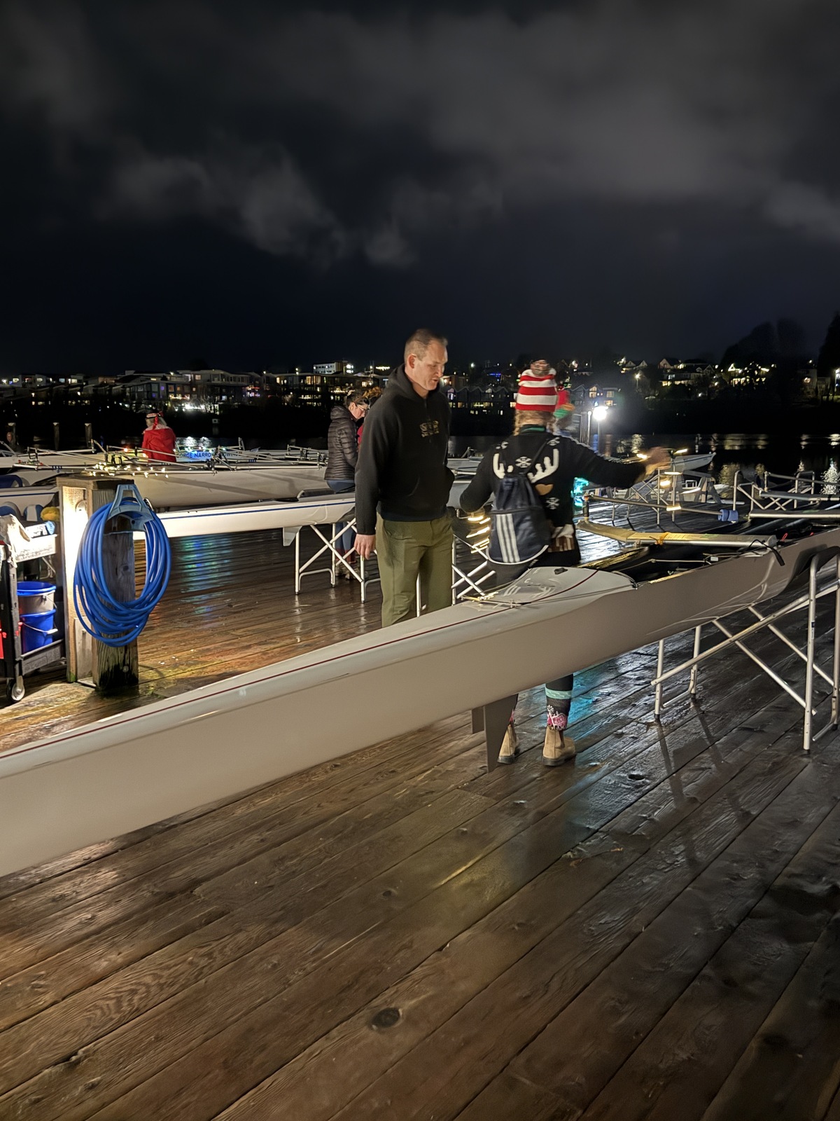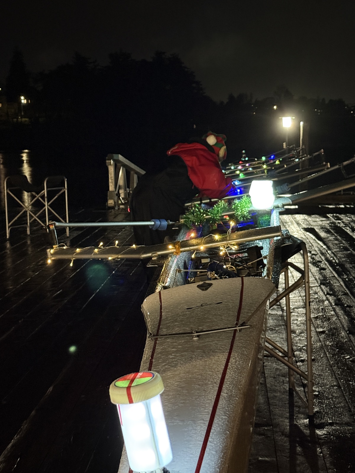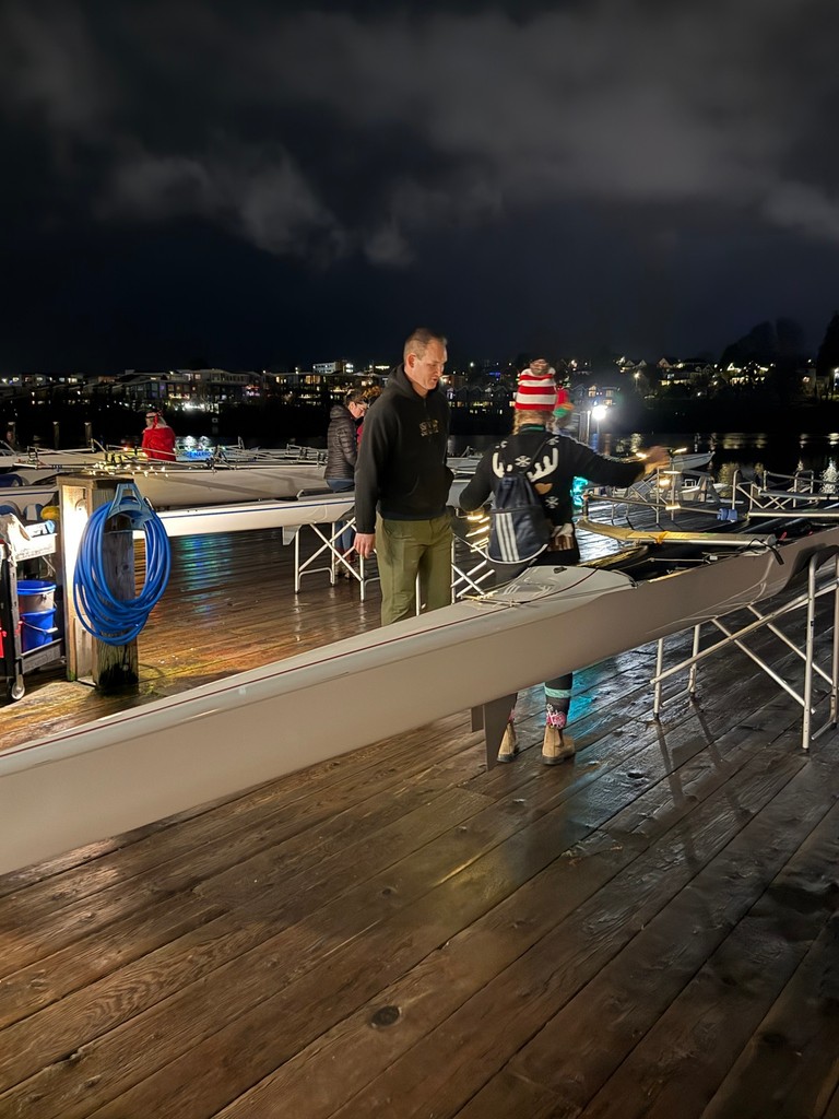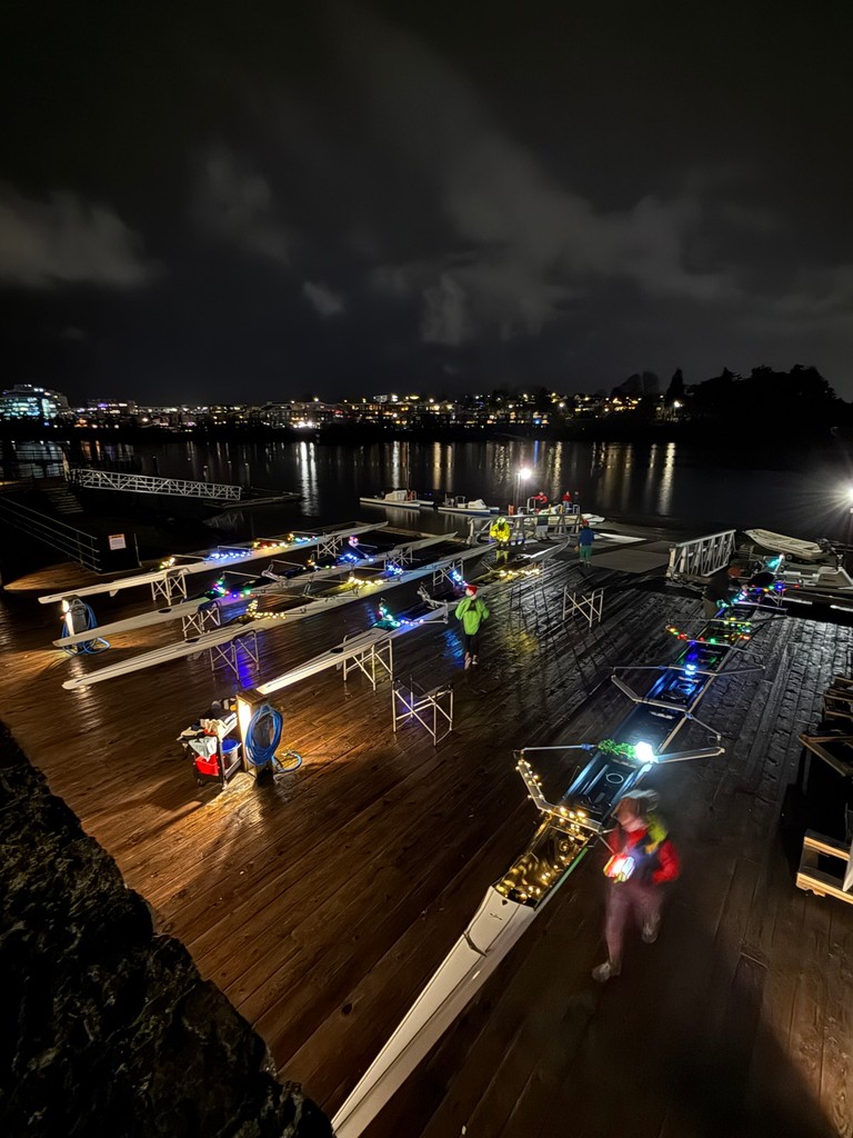boats on the dock.More boats on the dock.Two holiday rowers in the boathouse.Two rowers in VERY holiday sweaters.Five shells on the dock at night, all lit up.Rowers sipping cocoa in the boathouse.A lit up boat on the dock.The whole crew in the boathouse.A quad rowing in the Inner Harbour.A quad rowing in the Inner Harbour.