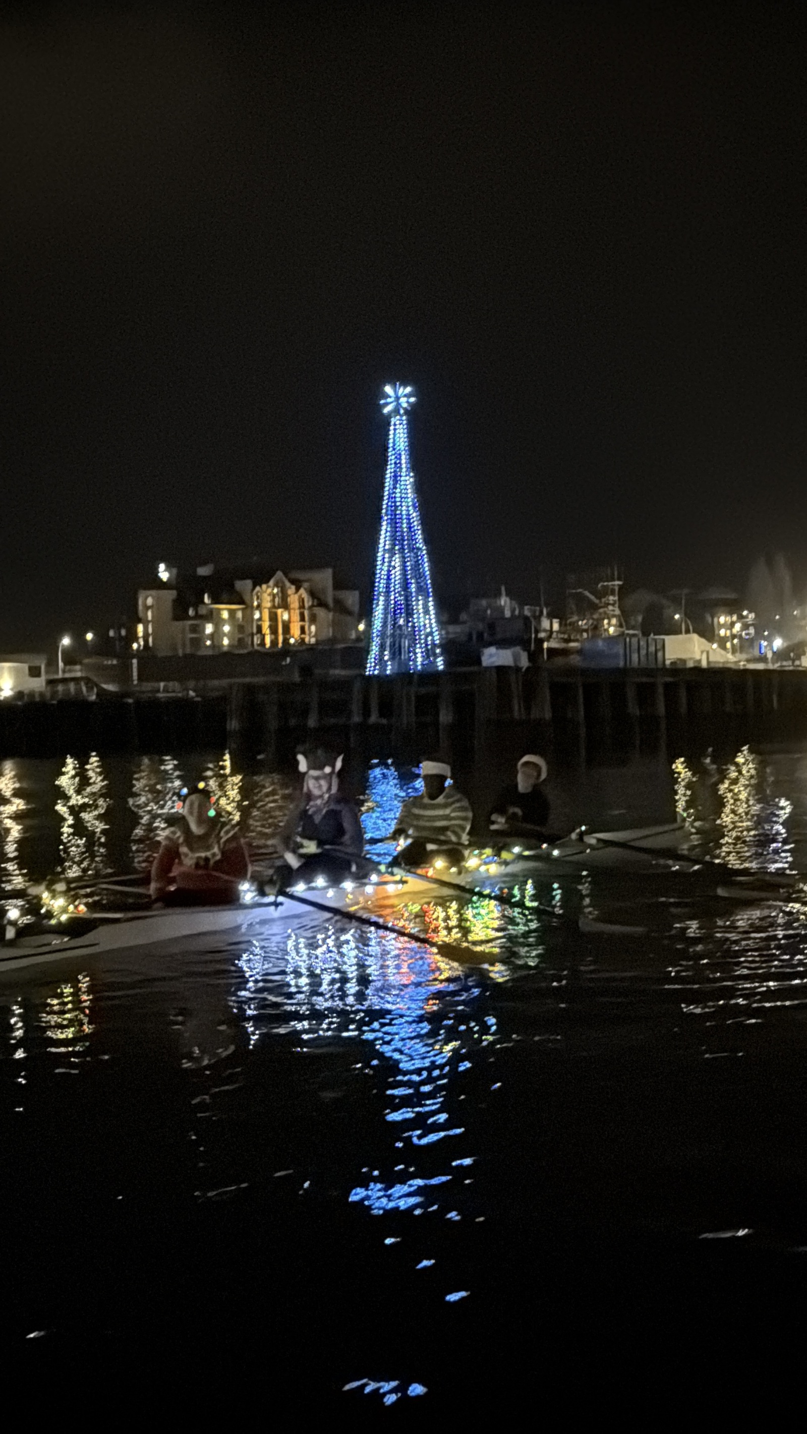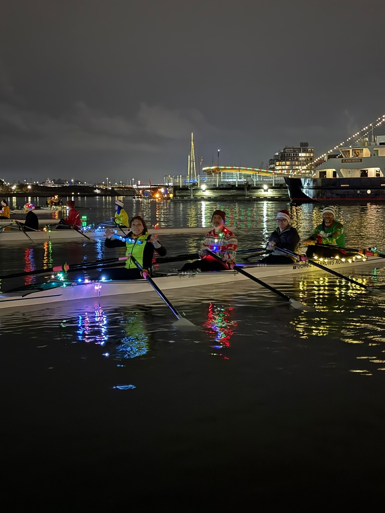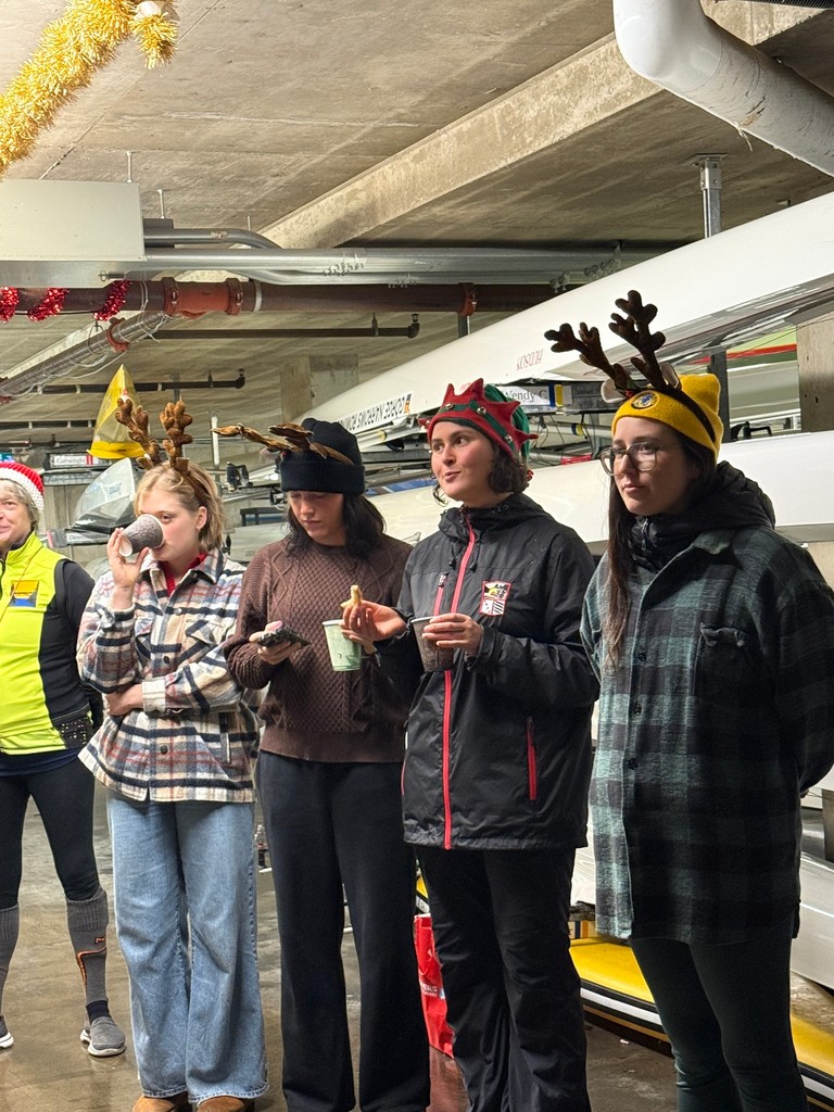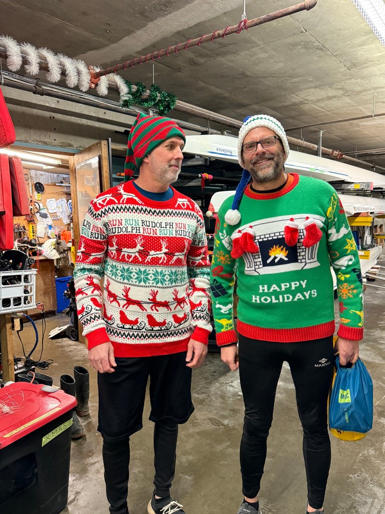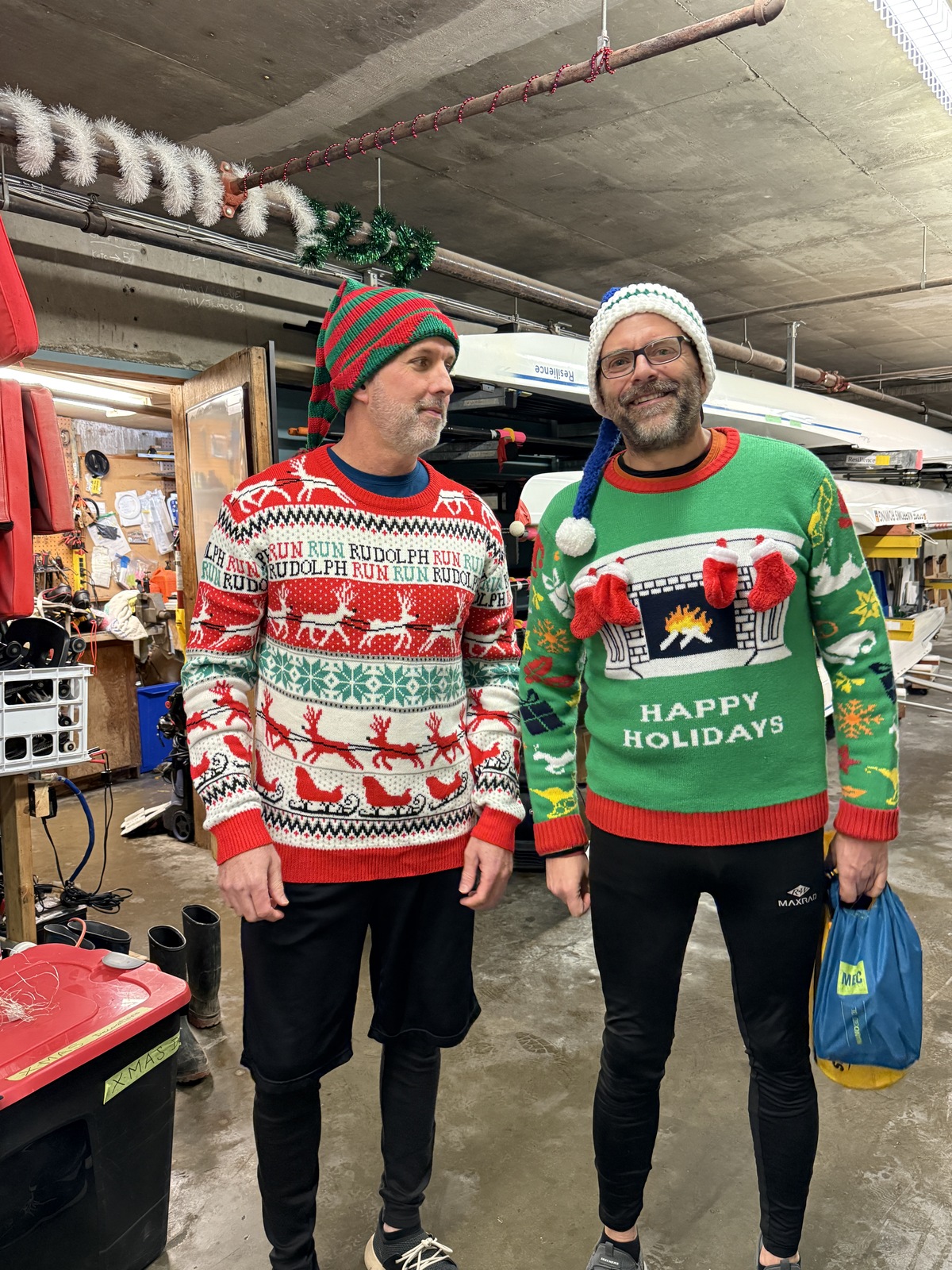 boats on the dock.More boats on the dock.Two holiday rowers in the boathouse.Two rowers in VERY holiday sweaters.Five shells on the dock at night, all lit up.Rowers sipping cocoa in the boathouse.A lit up boat on the dock.The whole crew in the boathouse.A quad rowing in the Inner Harbour.A quad rowing in the Inner Harbour.